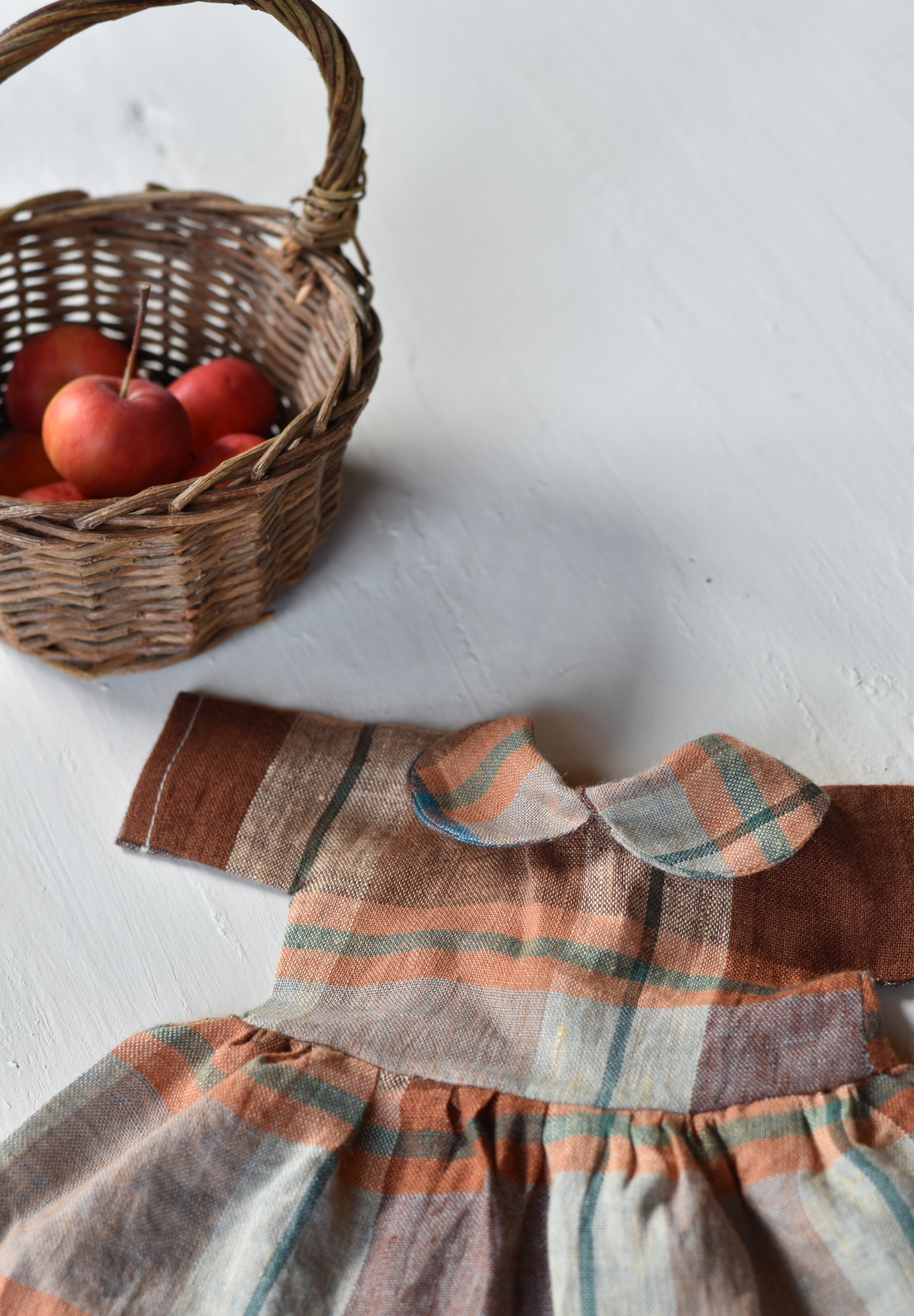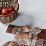 Inspired by orchard days and crisp Maine mornings, this grid plaid Gather Dress is a timeless addition to your doll’s wardrobe. Woven in warm shades of russet, cider gold, and soft blue-grey, its vintage-inspired palette captures the quiet beauty of fall.