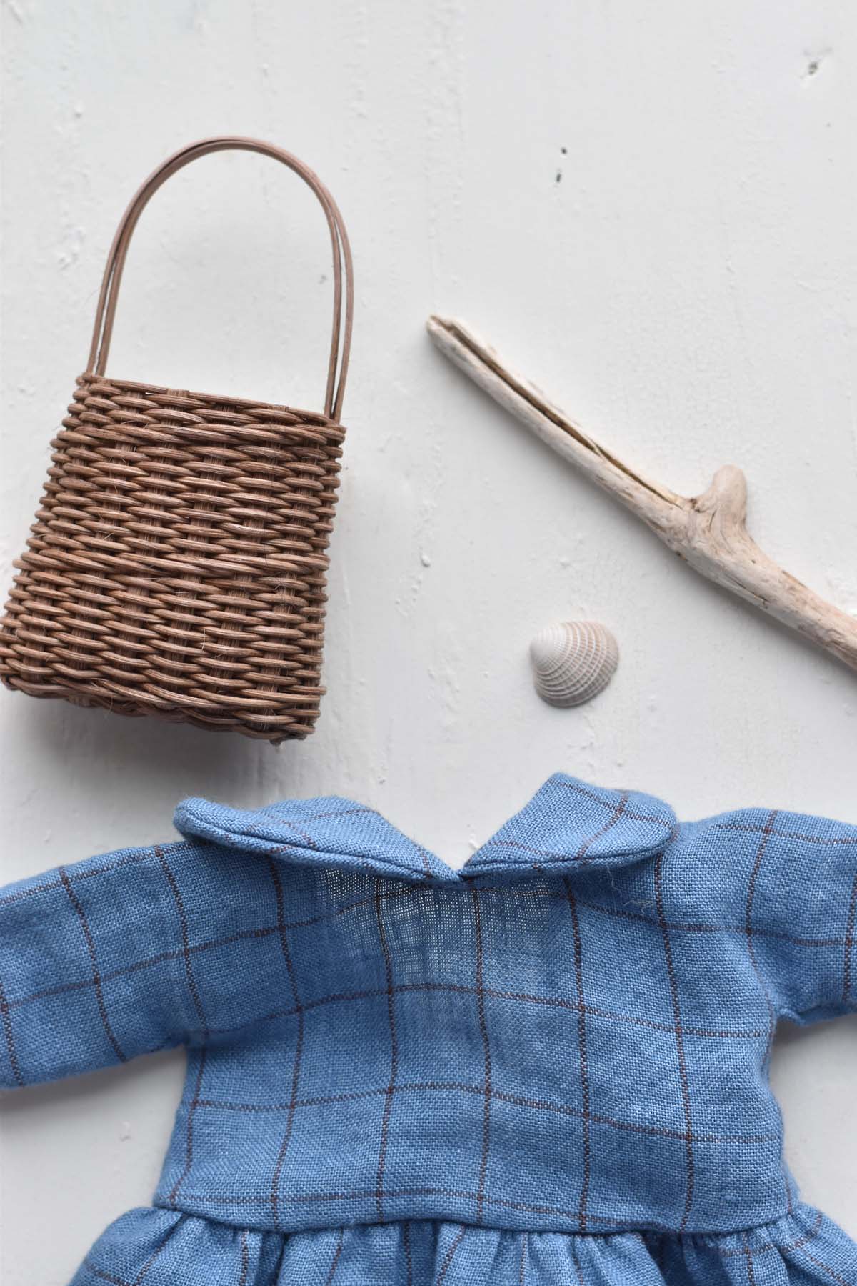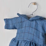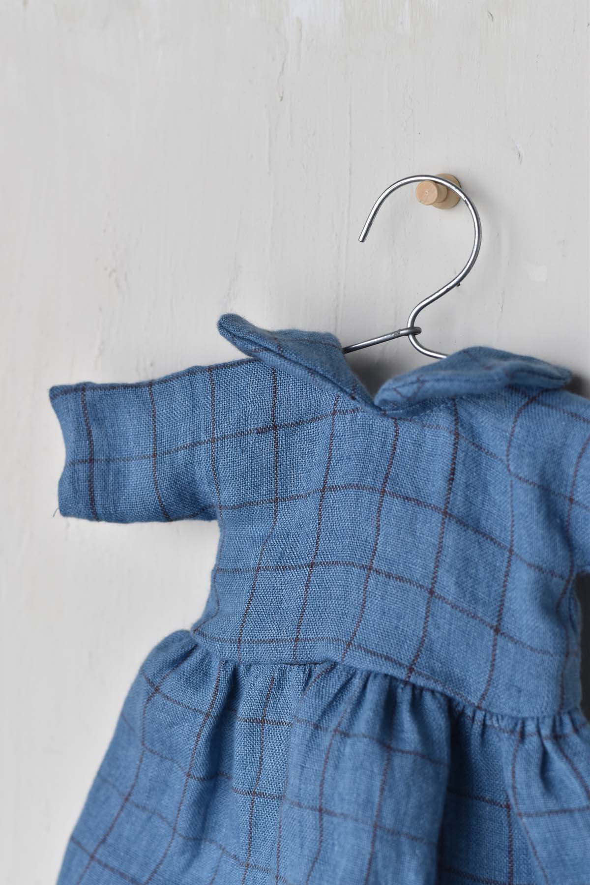 Our Downeast Linen dress is made from European linen in a classic blue checkered pattern. Designed with a nostalgic touch, it features a sailor-style collar and a gathered skirt, making it a perfect outfit for any of the Woolgrass Farm dolls.