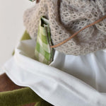 From orchard strolls to afternoon letter writing, Fern is always dressed with intention. She’s wearing a crisp white layered skirt paired with a hand-knit oat-colored sweater that echoes the coziness of fall in the garden. Around her neck, she’s tied a floral Liberty print handkerchief, and her soft green gingham satchel is just the right size for tucking away penpal letters and fig jam recipes.