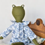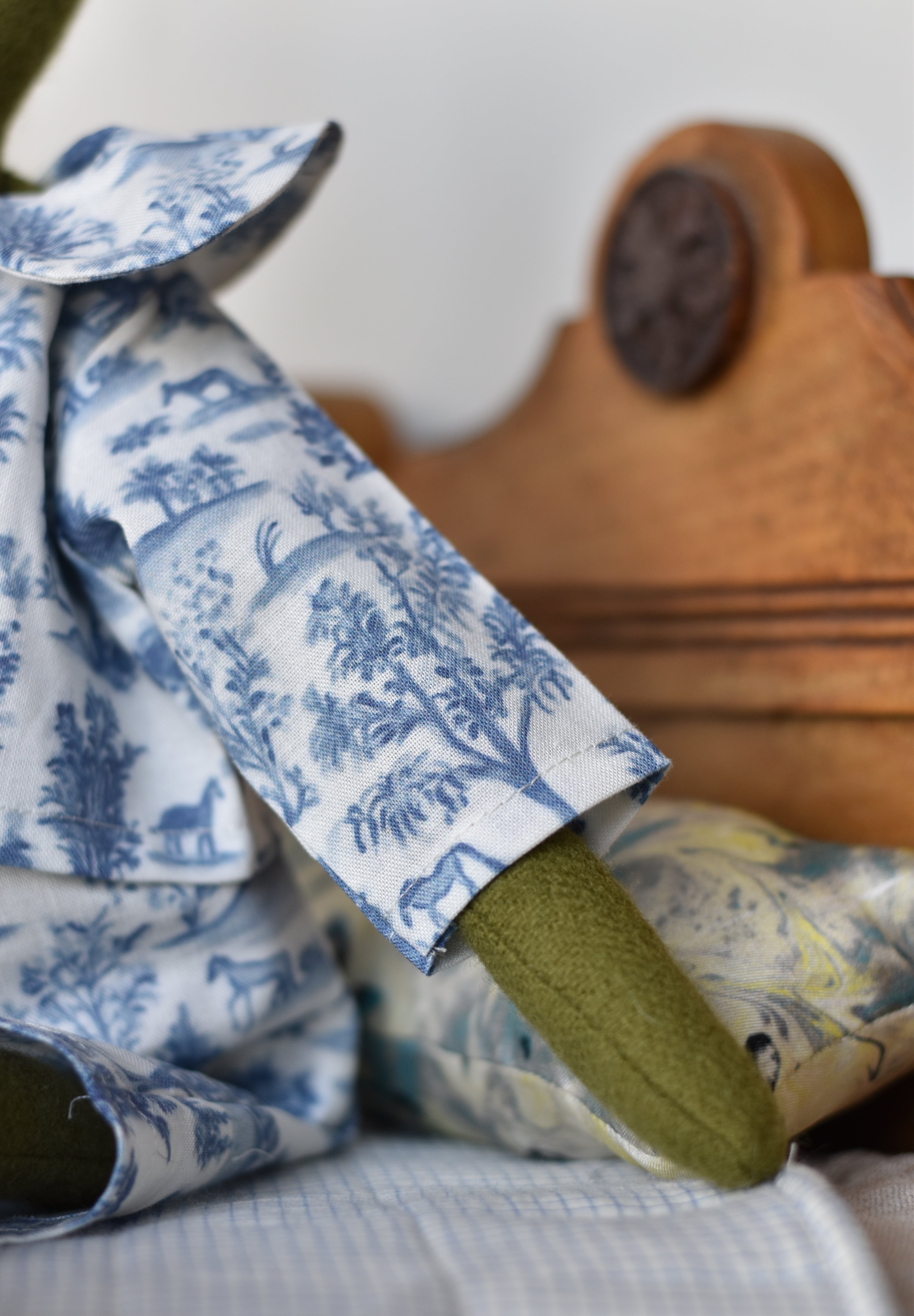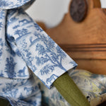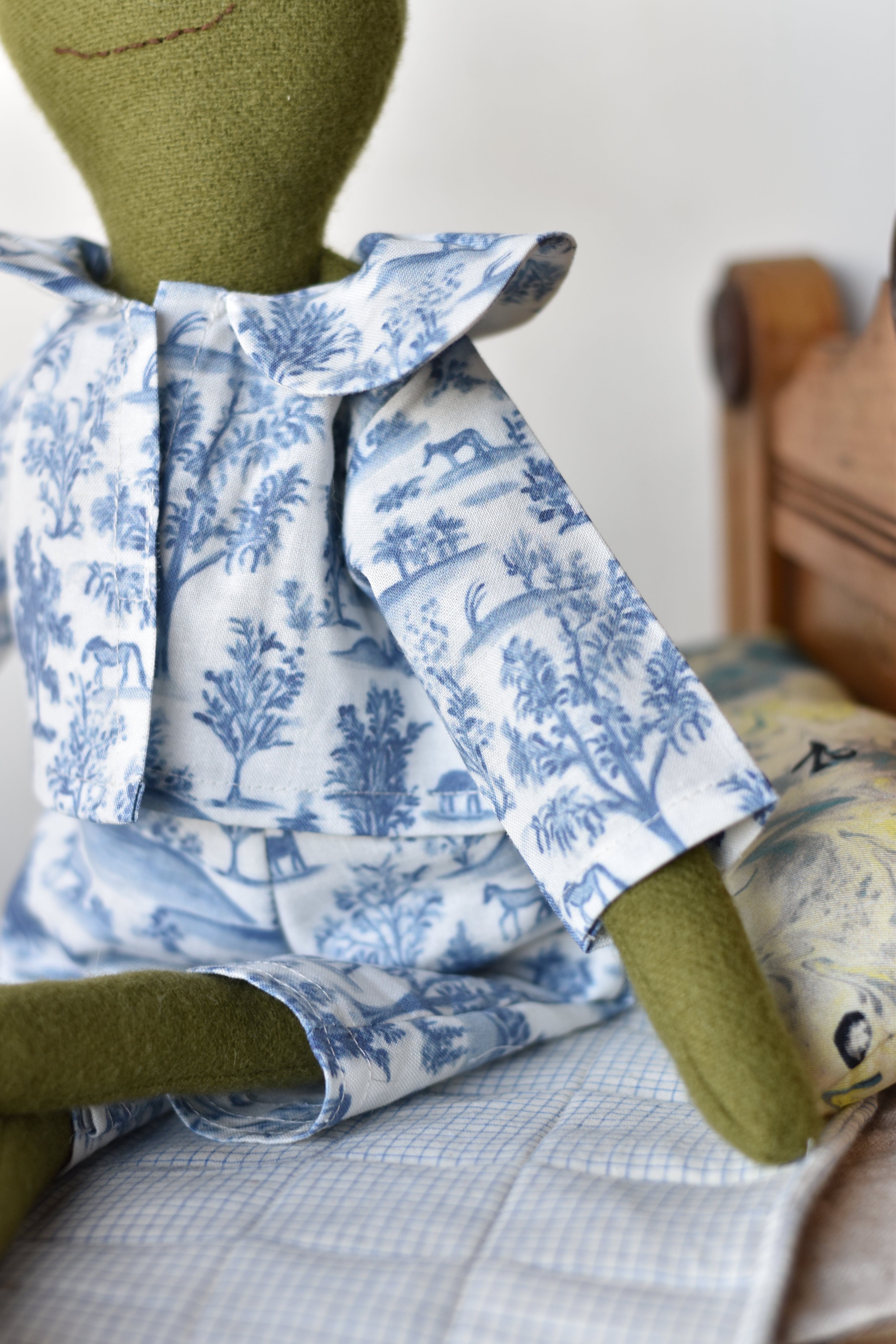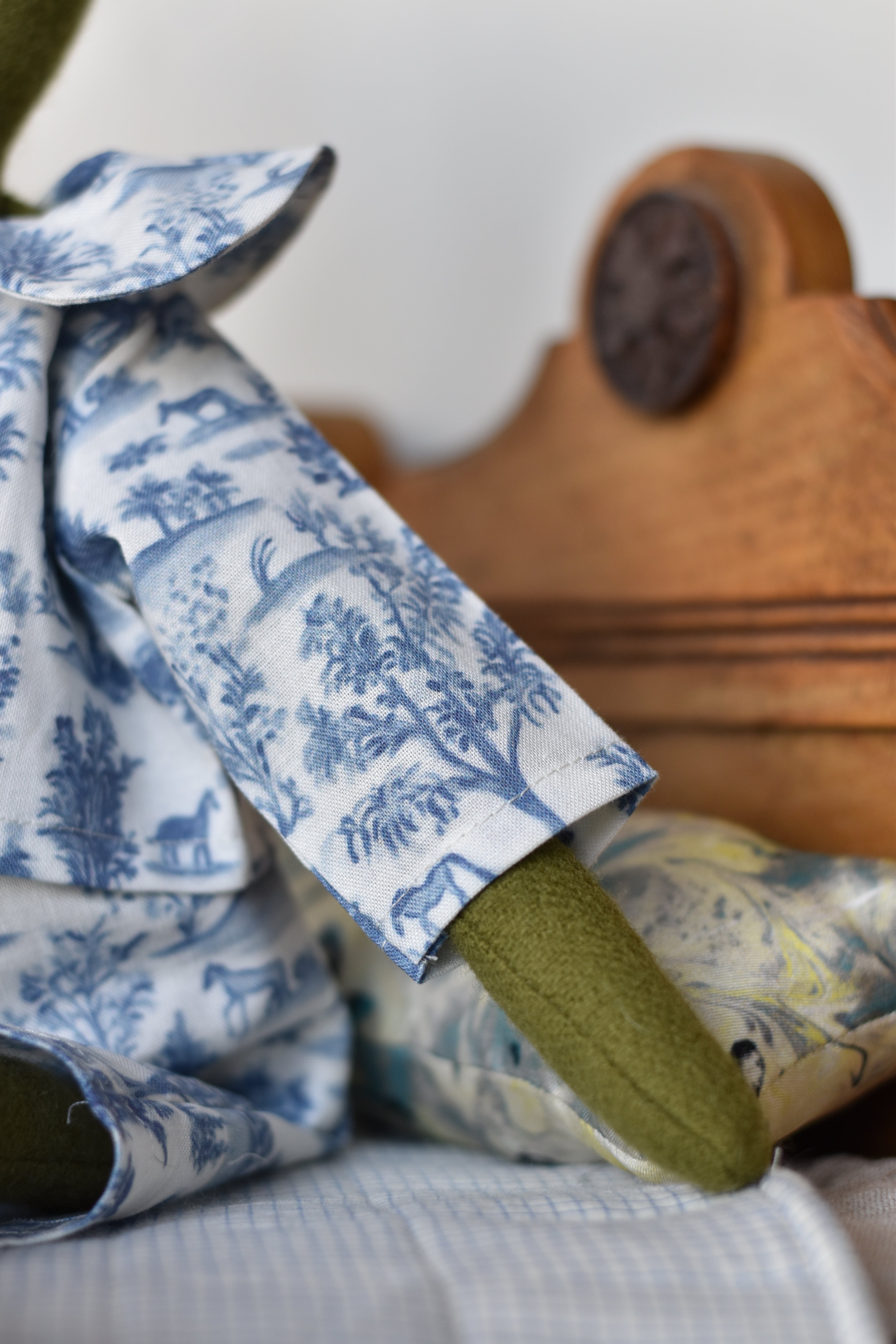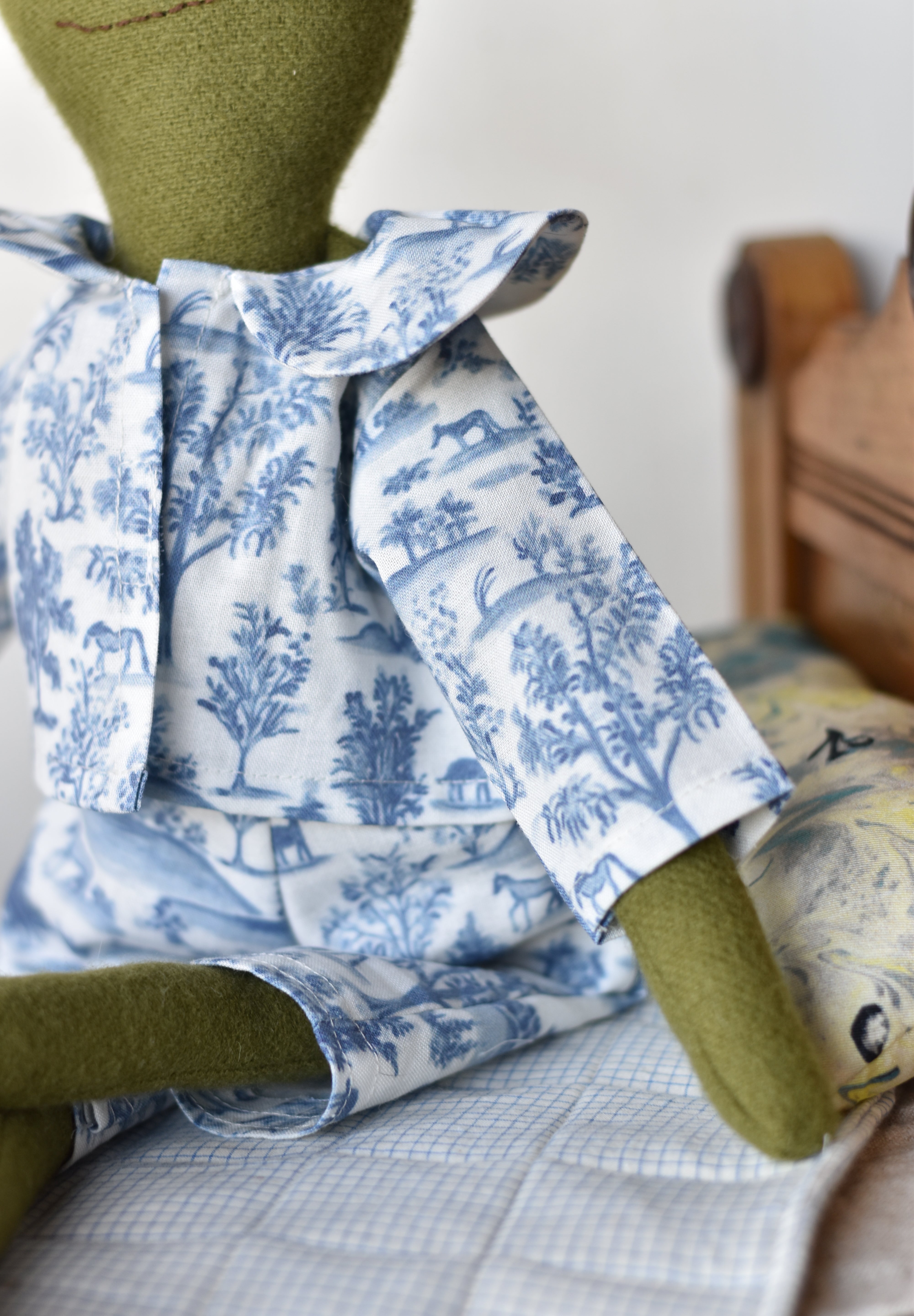 Fern is ready for a cozy night in—dressed in her favorite Horse Hill print pajamas featuring a pattern designed by California artist Stevie Howell. The charming horse toile print adds a touch of vintage whimsy, perfect for bedtime routines, morning daydreams, and slumber parties. This set also includes a coordinating silk marbled pillow for added charm and comfort.