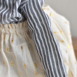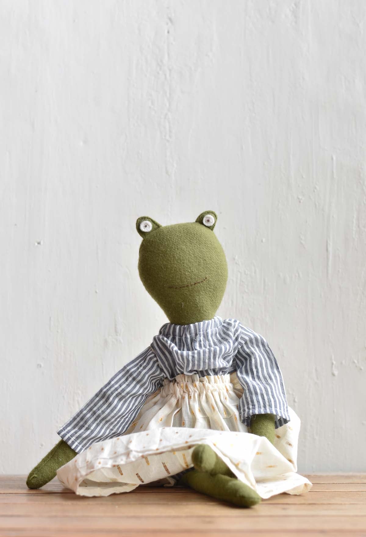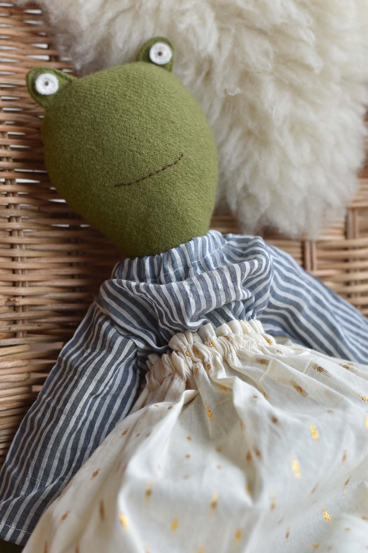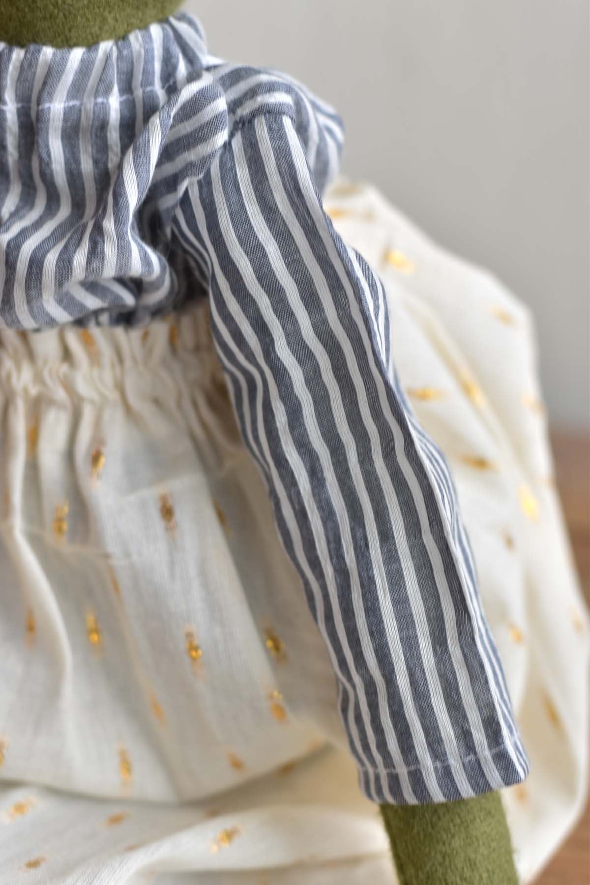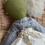 Handcrafted from soft wool and thoughtfully dressed by hand, this edition of Fern wears a gathered skirt in warm cream with subtle golden threads and a relaxed striped cotton blouse in soft blue-grey. The pairing feels both timeless and easy, like something worn on slow mornings and unhurried afternoons.