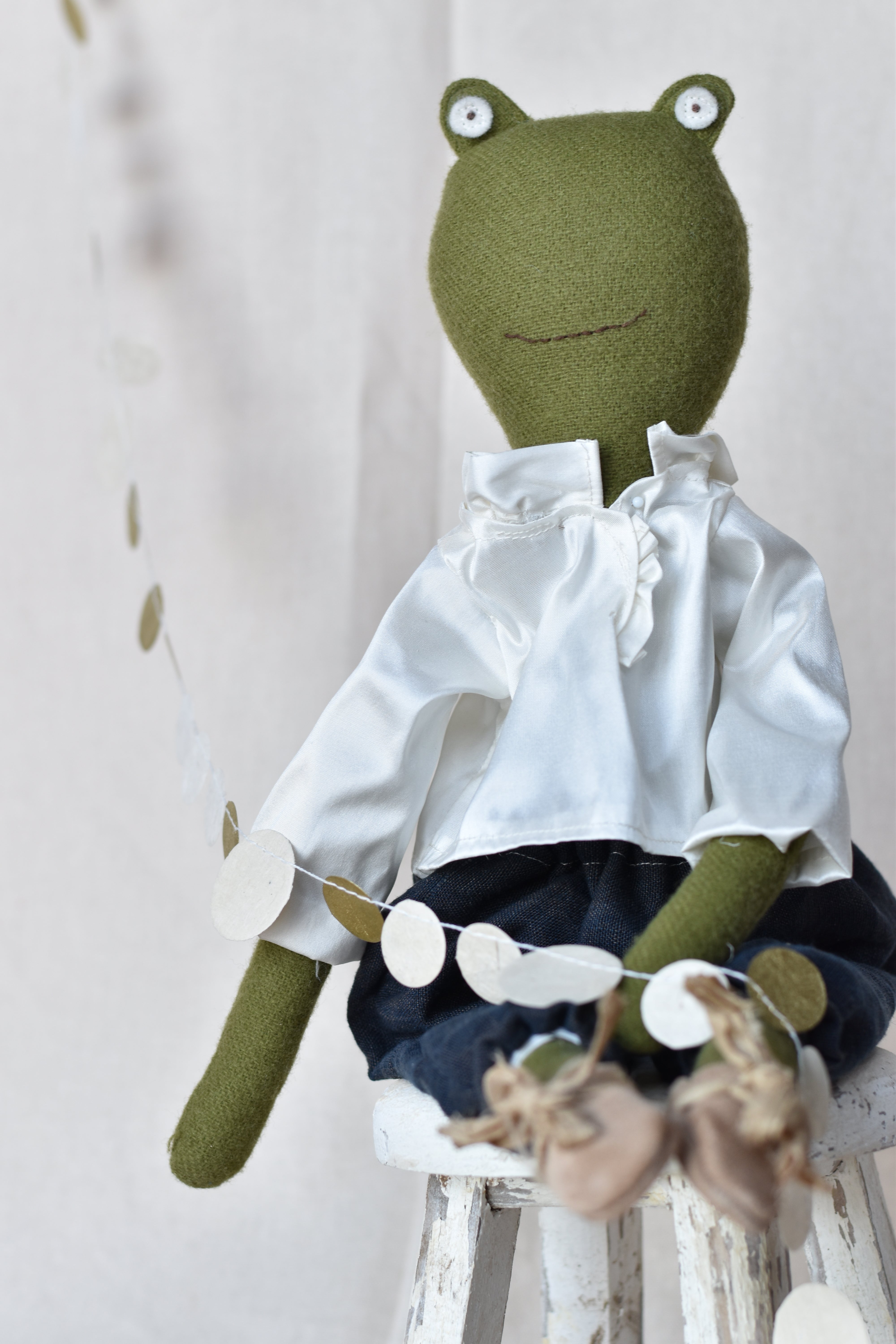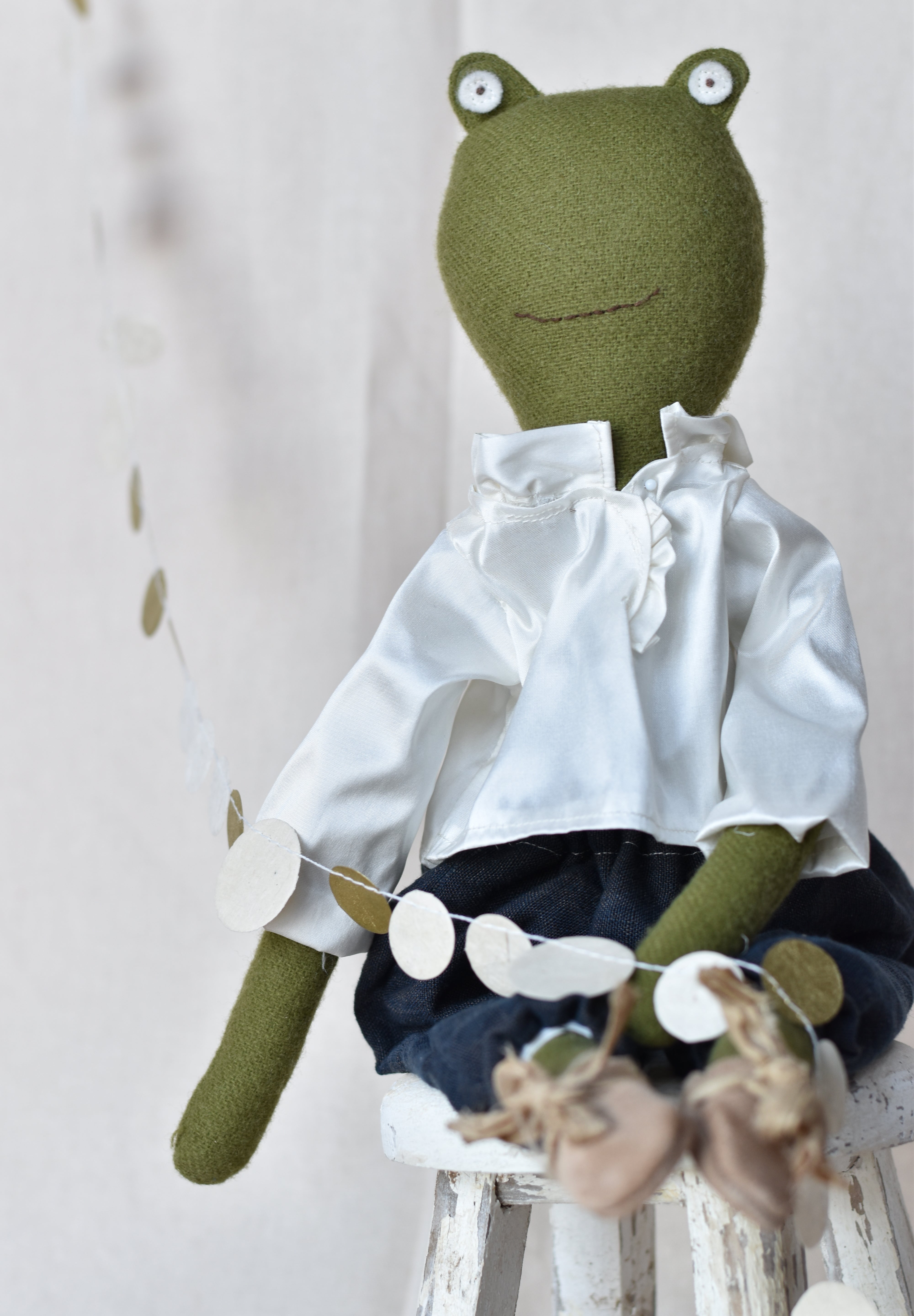 Fern the Frog in Silk Blouse & Indigo Trousers