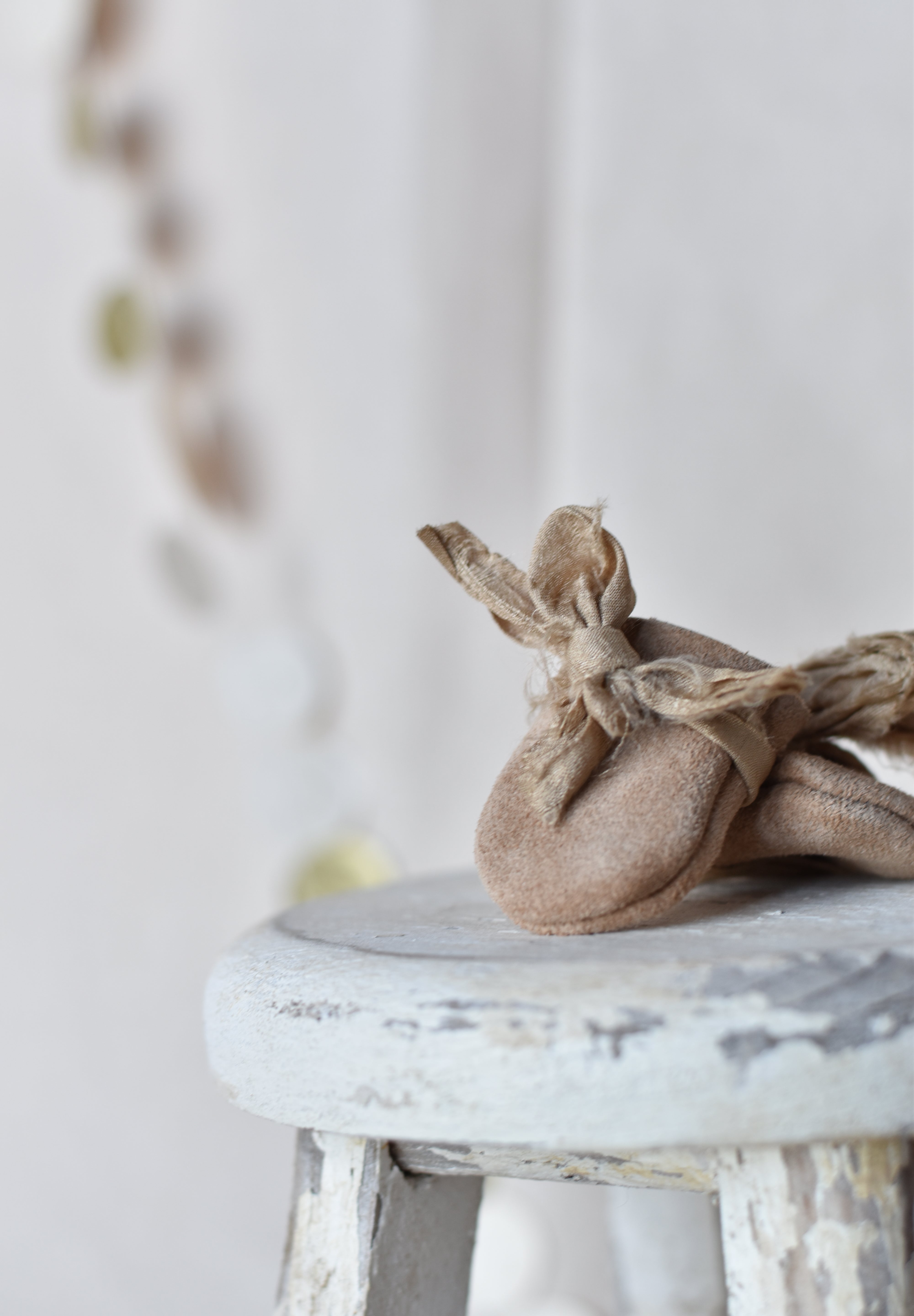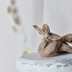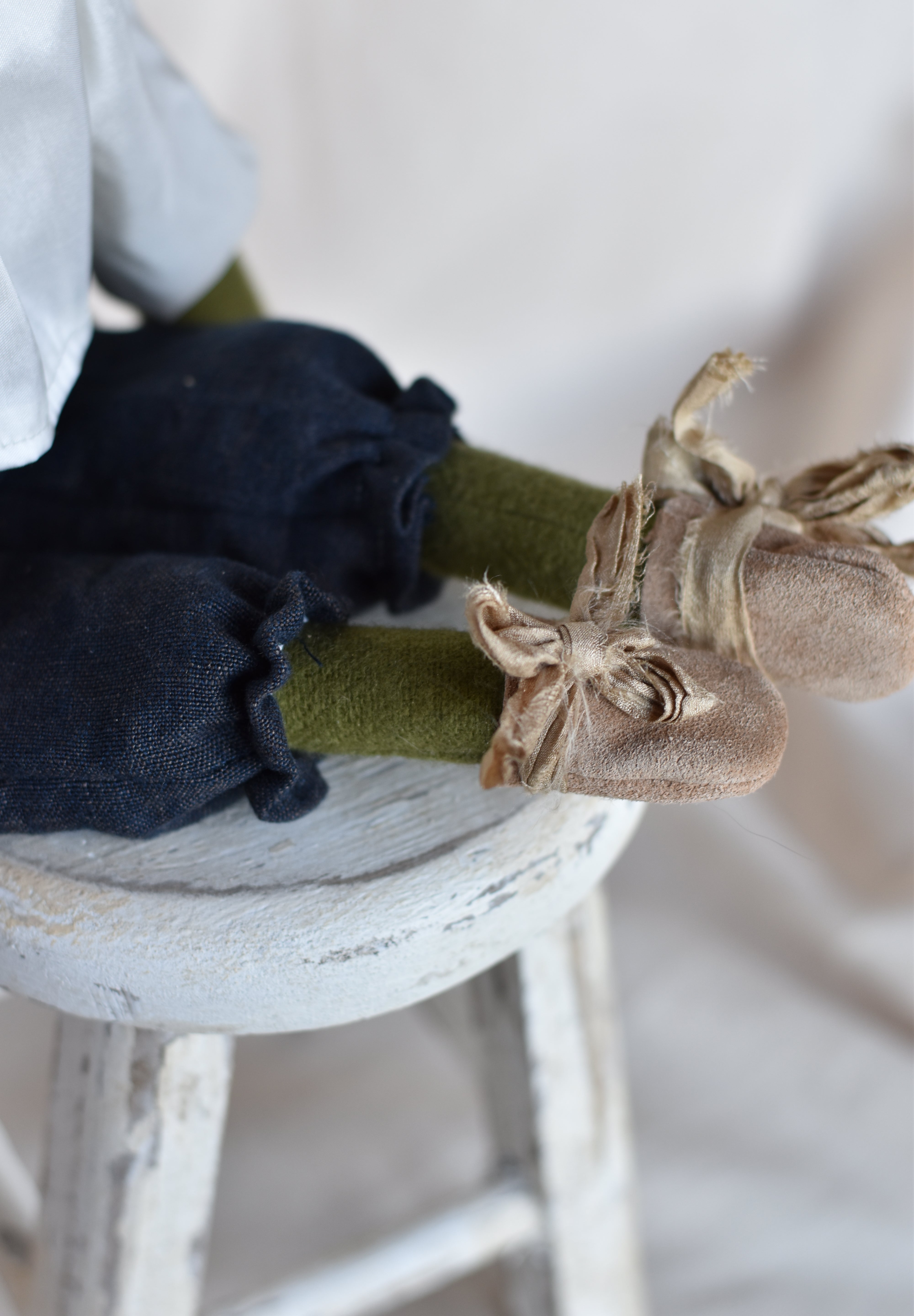 Meet Fern, dressed for celebration in a luminous salt white silk blouse—complete with a soft ruffled collar and vintage charm. Paired with deep indigo linen trousers and tied suede shoes, she’s ready for twilight parties, paper garland decorating, or writing letters by candlelight. Her blouse catches the light just so, giving her a gentle glow.