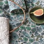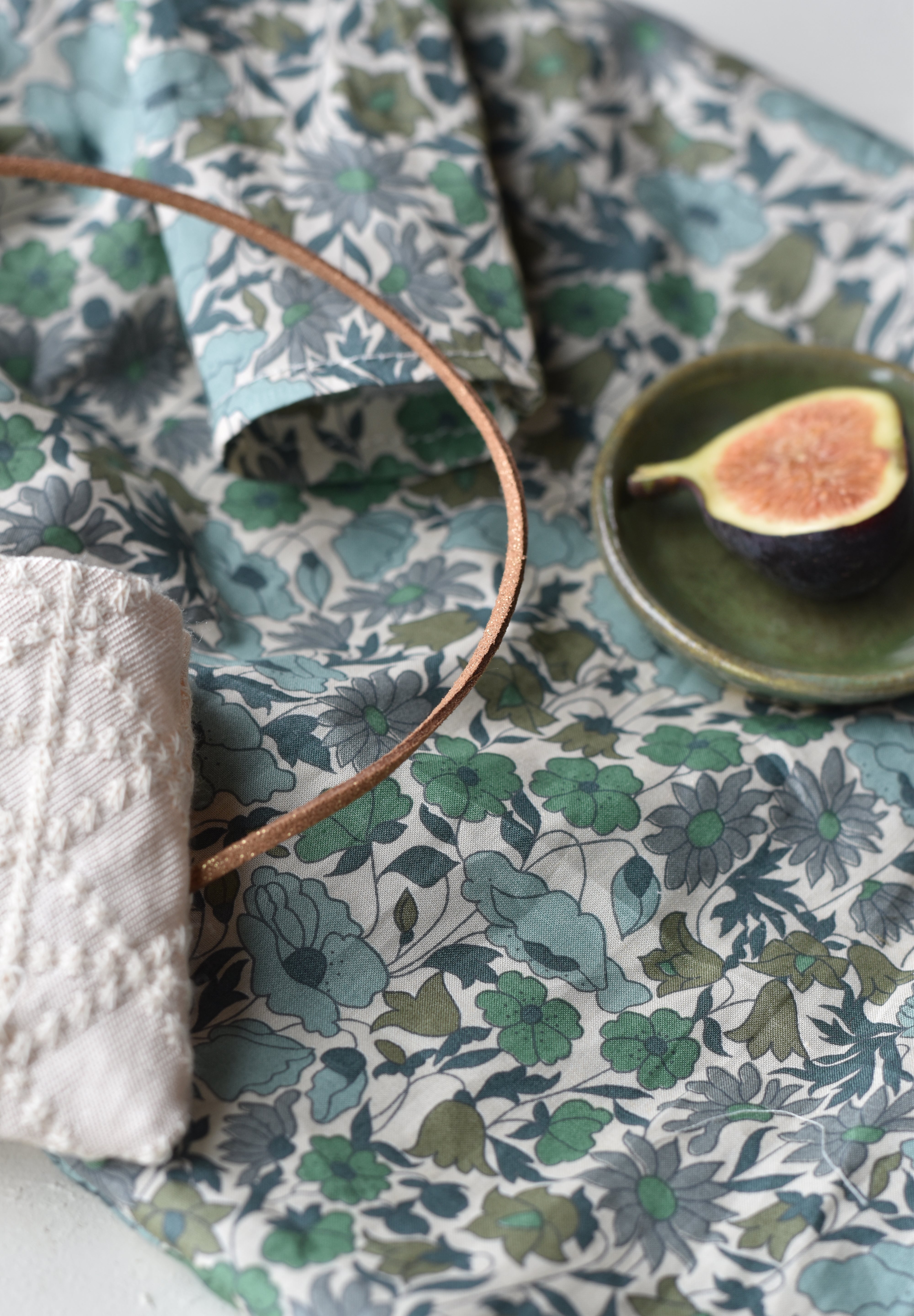 Fig is wearing her Liberty floral day dress paired with a hand loomed loopy scarf. Fig carries a coordinating satchel with a leather cord strap to carry all of her treasures.