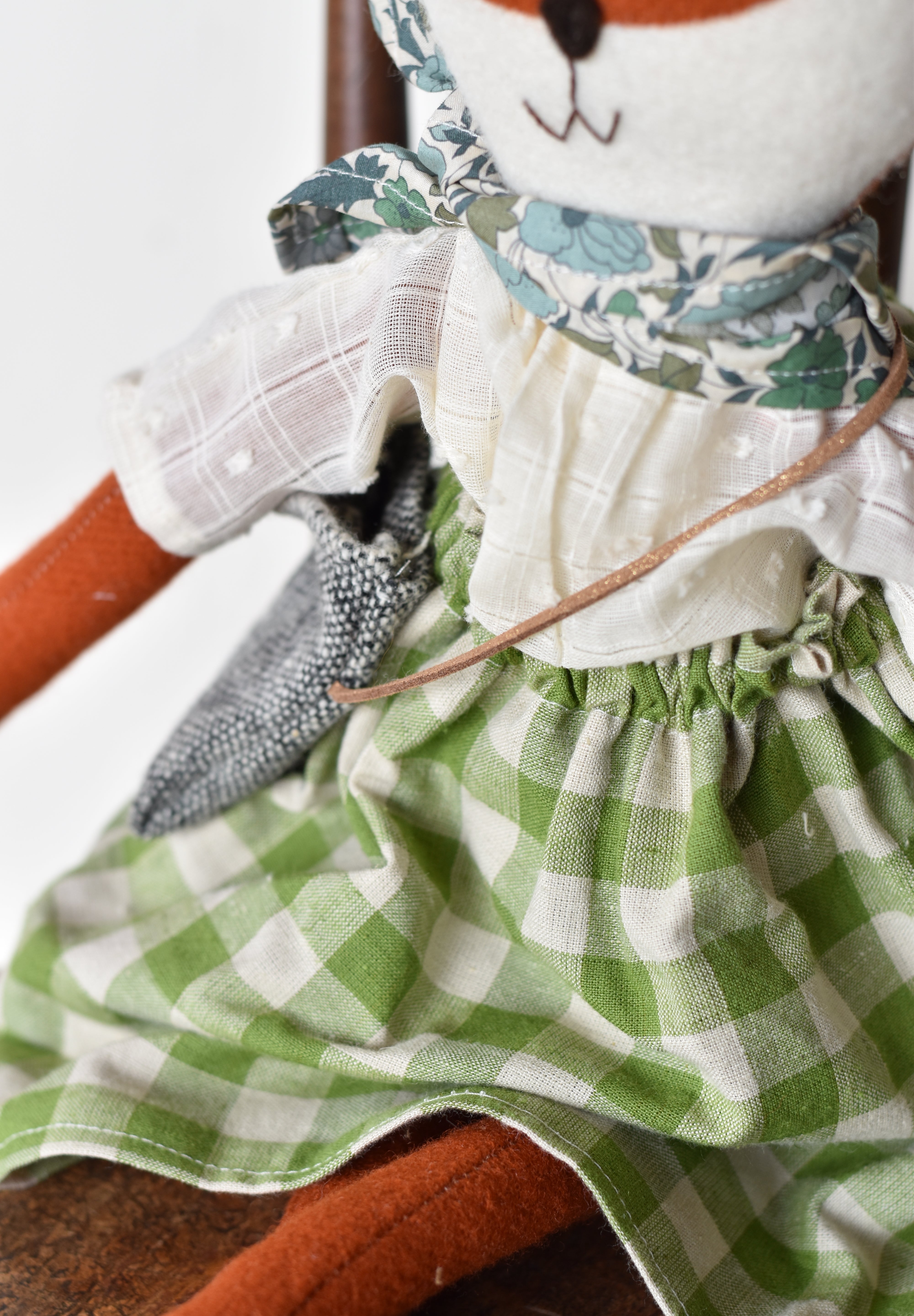 Meet Florette, a charming stuffed fox dressed in our gingham Ojai Orchard skirt paired with a hand-loomed cotton top paired with a liberty scarf. She carries a matching handmade woolen crossbody satchel, perfect for collecting treasures along the shoreline.