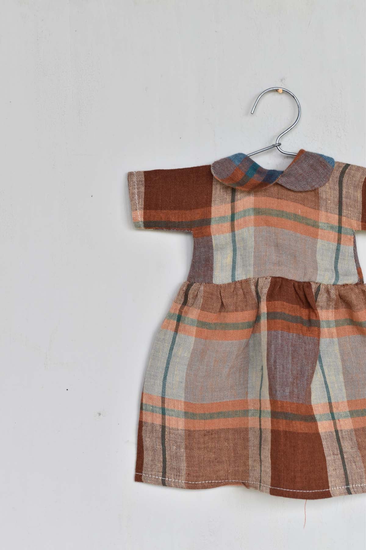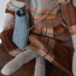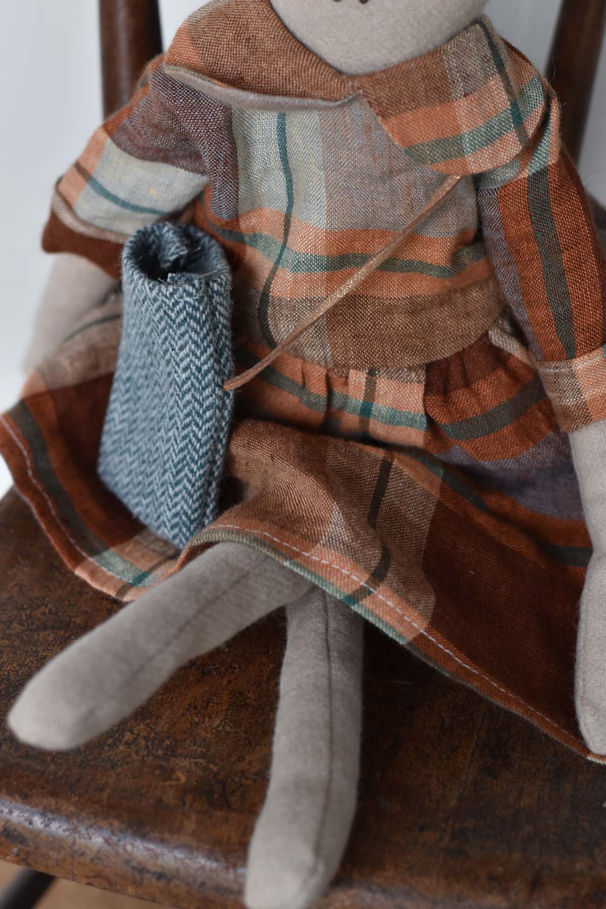 Mae is handmade and dressed in a beautiful European linen gingham dress with a Peter Pan collar. She also coordinates with a coordinating crossbody satchel. Mae is ready for her next adventure. Soft, timeless, and handcrafted, she’s made to be treasured.