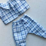 The blue gingham-inspired fabric was designed by California artist Stevie Howell, whose painterly textile work brings a touch of modern charm to this heirloom collection.